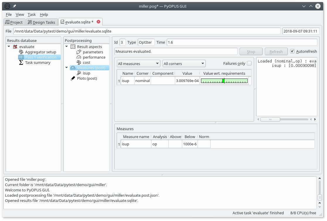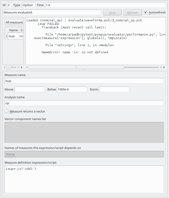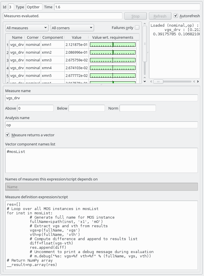 Measure definition expression/script - Pythonic expression specifying how the value of the performance measure is computed. See sections pyopus.evaluator.performance — System performance evaluation, pyopus.evaluator.measure — Performance measure extraction, and Miller opamp design with PyOPUS for more information.