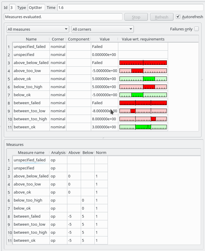 The middle part is dividen in two parts. The left part displays the values of performance measures in a table. Above the table are two selectors for filtering the displayed performace measure values according to the measure name and corner name. The “Failures only” checkbox limits the display to only those measure-corner pairs for which the performance measure fails to satisfy the requirements specified in its definition. The right part displays a log of measure evaluation. It can be used for debugging errors in performance measure definitions.