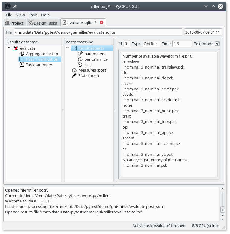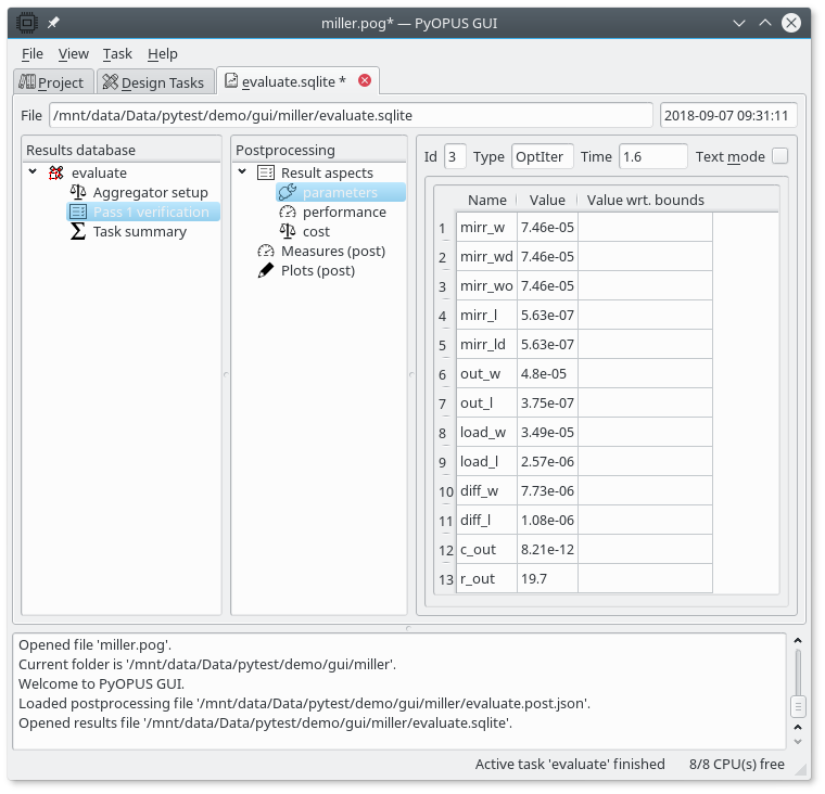The “Pass 1 verification” node (which is an optimization iteration node) holds the actual results of the circuit evaluation. It has three aspects (parameters, performance, and cost). The performance and cost apects are empty because we did not define any performance measures is the project/task. The parameters aspect holds the values of the design parameters for which the circuit was evaluated.