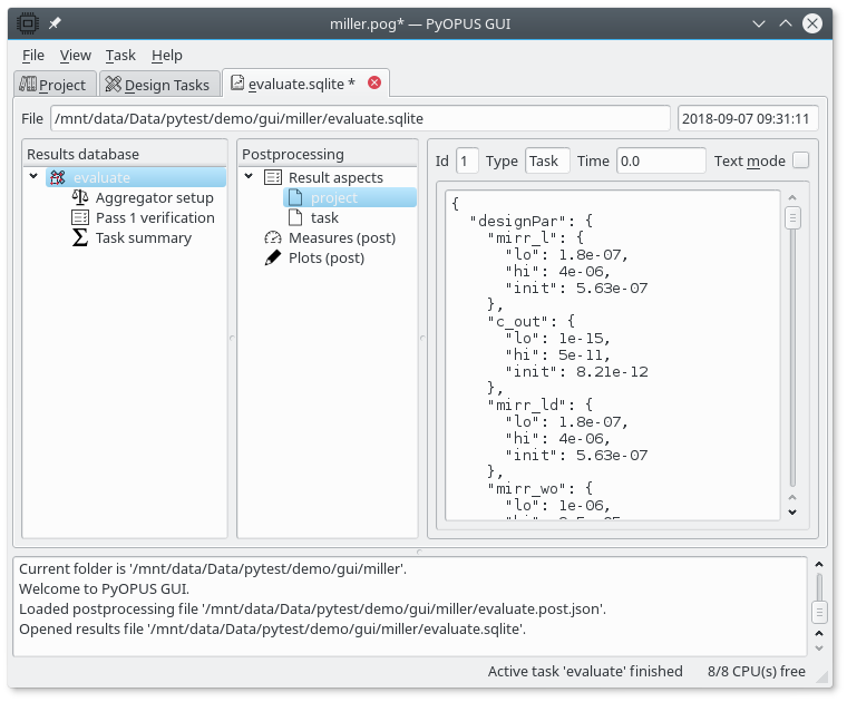 The top of the results tab displays the path to the database file and the timepoint when the database was created. The display is updated as new data is added to the database. The database is organized as a tree. Every node in the tree can have one or more aspects holding various data. The tree is displayed in the left part of the tab (Results database). The available aspects, posprocessing performance measures, and postprocessing plots for the selected result node are listed in the middle part of the tab (Postprocessing). The data corresponding to the selected aspect are displayed in the right part of the tab.