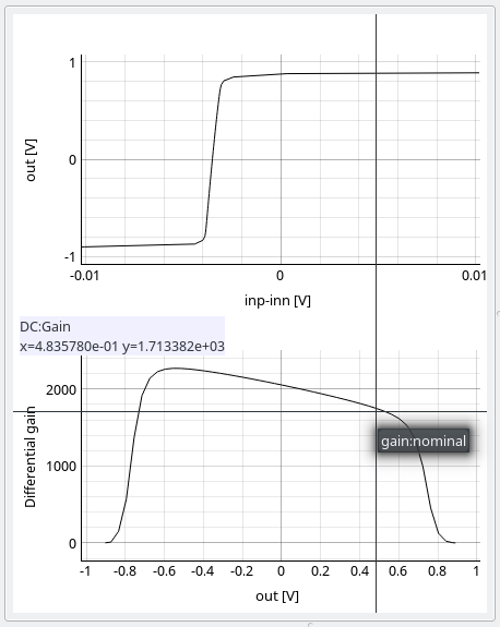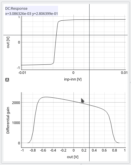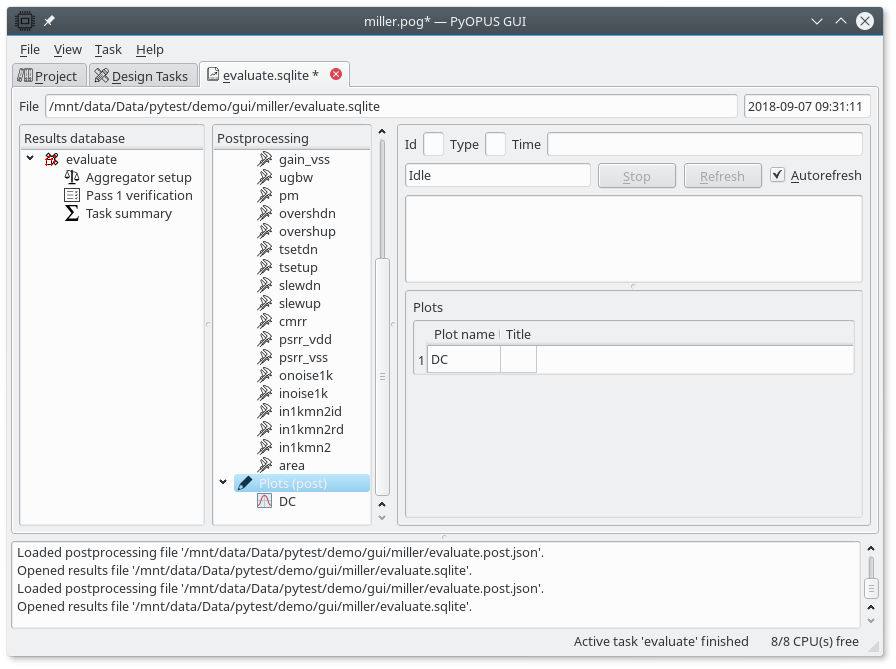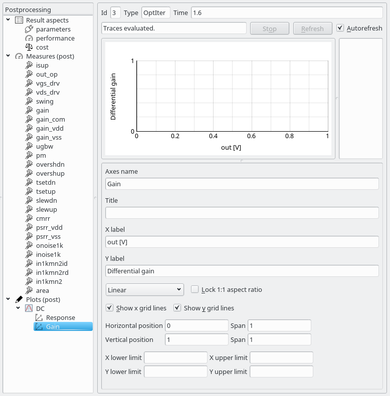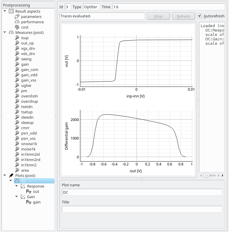 Now let us create a plot divided in two axes. Top axesdisplay the DC characteristic of the Miller opamp, while the bottom axes display the differential gain vs. the output voltage. A new plto can be created as a sub item under the “Plots (post)” tree item in the Postprocessing tree or it can be added as a new entry in the table summarizing all plots. This table is displayed if you select the “Plots (post)” tree item. The plot name must be a valid identifier. We choose “DC” as the plot name. The plot title is currently not displayed. It can be used for entering a short comment.