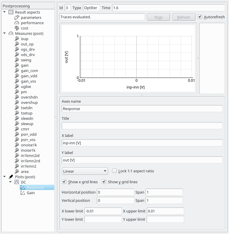 Axes are defined by adding subitems to the plot item in the Postprocessing tree. We create two subitems names “Response” and “Gain”. When any of them is selected its properties are listed in the editor on the bottom of the display area. The top left part of the display area will display the selected axes and all traces defined for the selected axes. The following properties can be set for axes.