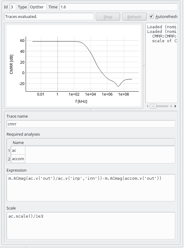 The CMRR trace depends on two analyses: ac and accom. Therefore expressions that define the x and y axis values must now refer to the simulation results as