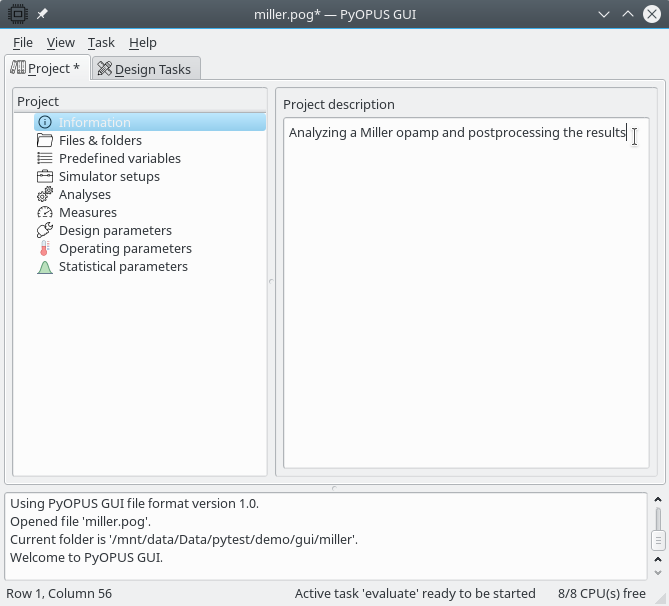 The GUI window pops up. Now we can set up the project. In the GUI window we can add some comments under the “information” node of the project.