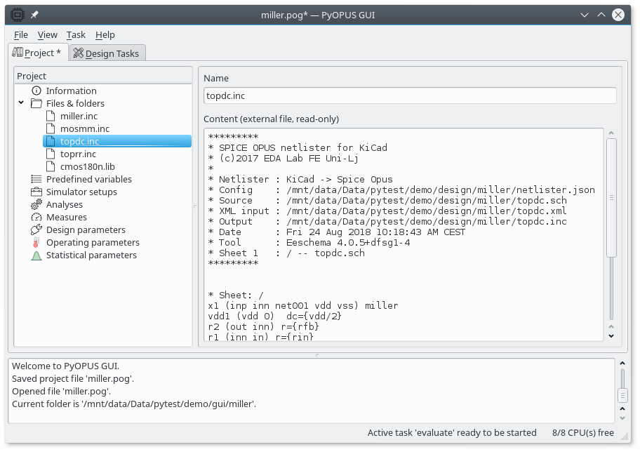 Next, we are going to copy the MOS models (cmos180n.lib), and the netlist fragments (miller.inc, mosmm.inc, topdc.inc, and toprr.inc) to the newly created folder. The explanation of these files can be found in section Simulator input files (Spice Opus) of the Miller opamp design demo.