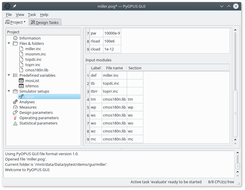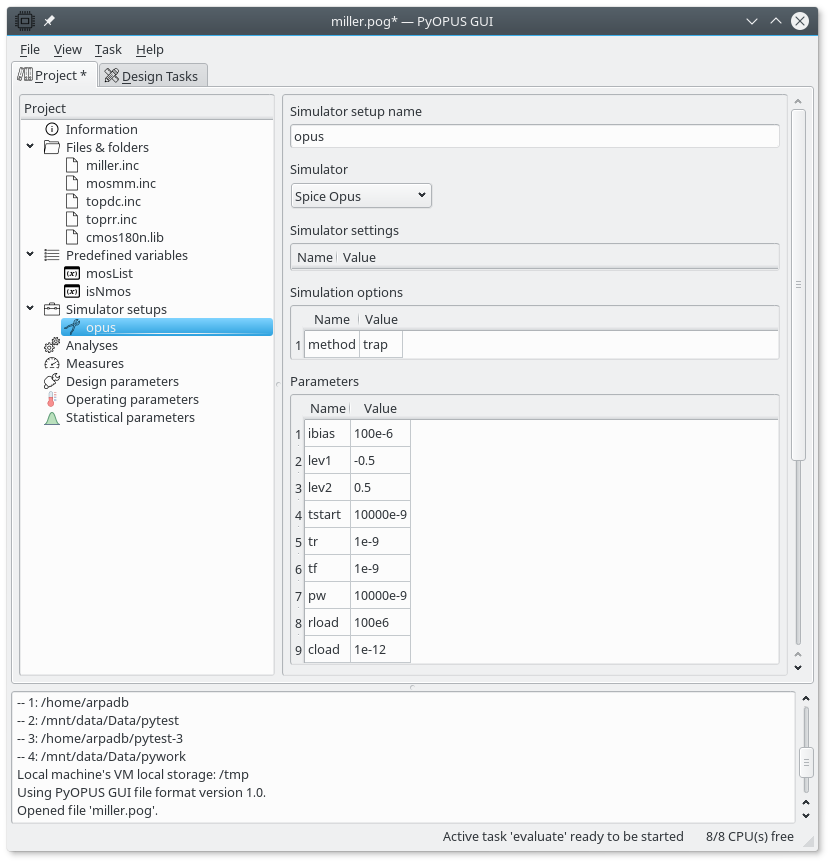 Select “Spice Opus” as the simulator type. Under SImulator settings you can enter the arguments that will be passed to the simulator class at construction of a simulator object. Under Simulator options you can specify the options passed to the simulator via its input netlist. These options are valid for all analyses. Under Parameters you can enter the values of netlist parameters that are common to all analyses and all corners. Finally, under Input modules you define netlist modules that will be used by analyses and corners.