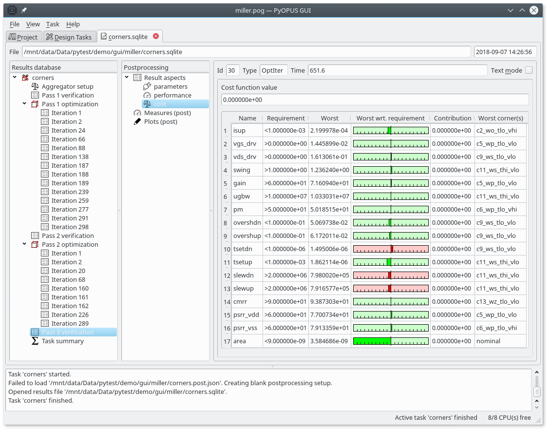 The cost function of the final circuit. Some performance measures do not satisfy the design requirements (tsetdn, slewdn, slewup). Note that they were not subject to optimization (see the Requirements item in the task’s setup).