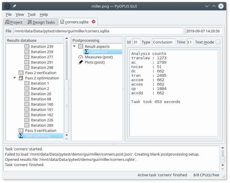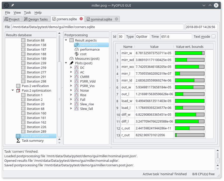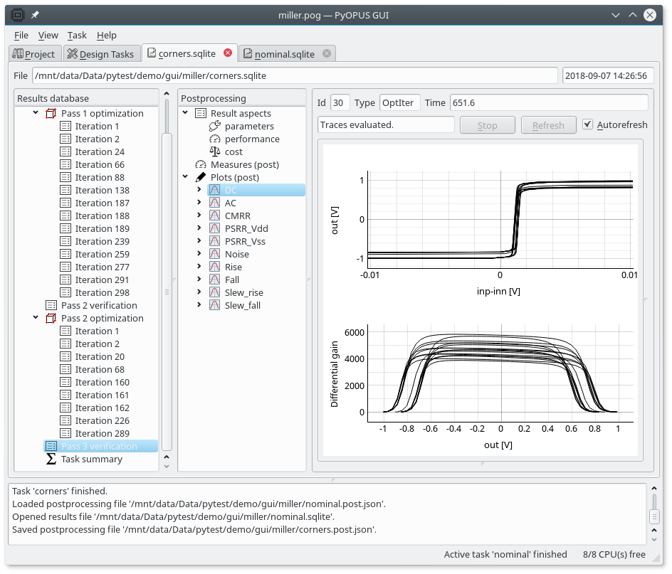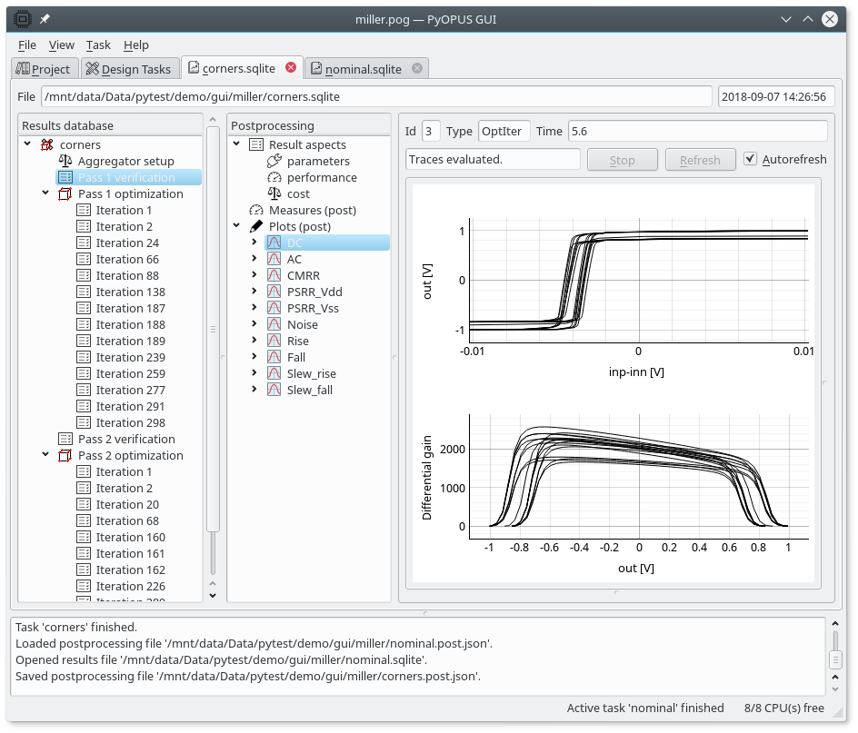 To plot the waveforms open the results of the “nominal” task and copy/paste the postprocessing setup to the Results tab of the “corners” task. Now we can examine the DC response of the initial and the final circuit.