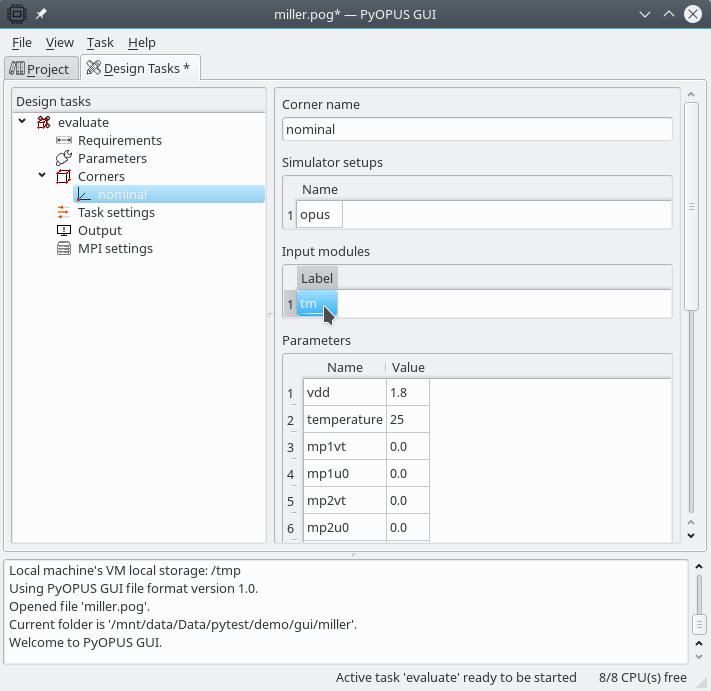 A corner is a combination of operating parameters and device models. Usually a corner describes some extreme combination of operating conditions and device models. We expect the circuit’s performance measures to reach their extreme valus in corners. When we crated the evaluation task a “nominal” corner was automatically created. The “nominal” corner comprises nominal operating parameter values. Because when we were defining analyses we did not specify the MOS transistor model we must specify it in the “nominal” corner definition. We are going to use the typical model defined in input module “tm”.