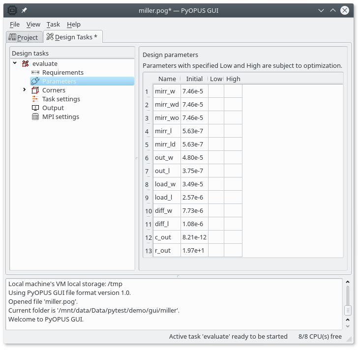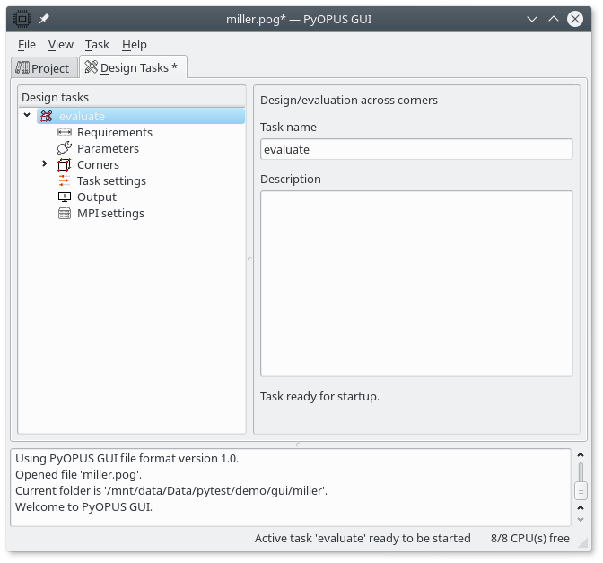 You can add a description to the task. The Requirements item is empty because we are not going to design the circuit. We are only evaluating it. Select the Parameters item. The Design parameters from the project were automatically copied. The task allways uses the values specified here instead of those specified in the project. We deleted the lower and the upper bound on the parameter values because they are not needed for circuit evaluation. There is nothing to do here. If, however, you want to use different values for the design parameters you can enter them here.