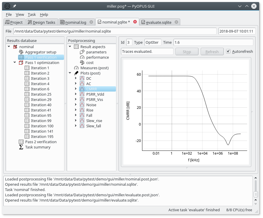 Of all the result nodes only the initial circuit evaluation (Pass 1 verification) and the final circuit evaluation (Pass 2 verification) have available waveforms. Select the initial circuit evaluation node and click on the CMRR plot in the Postprocessing tree. The CMRR response of the initial circuit is plotted. To make the plot bigger you can hide the top right and the bottom pane of the display by moving the splitters.