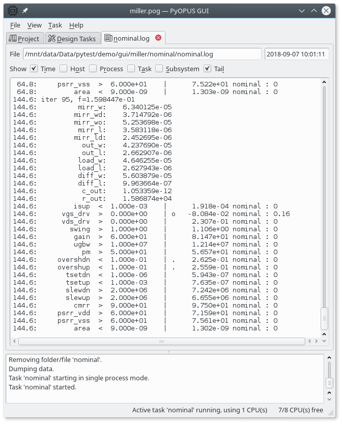 When the task is running, open the log by selecting Task/View log from the main menu. The task’s progress is written to the log and the log tab will make it possible for you to follow it. For every circuit verification and every candidate circuit that improves the cost function the circuit’s performance will be printed.